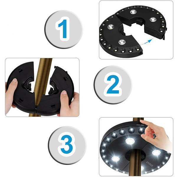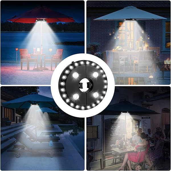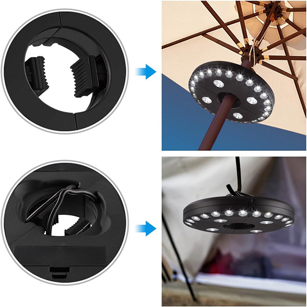 A szokásos ernyőfényekkel ellentétben a BRELLAGLO bárhol használható, ahol szüksége van rá. Rögzítse egy ernyőre a teraszvilágításhoz, vagy használja a beépített kampókat a felakasztáshoz—tökéletes kempingezéshez és szabadtéri kalandokhoz.